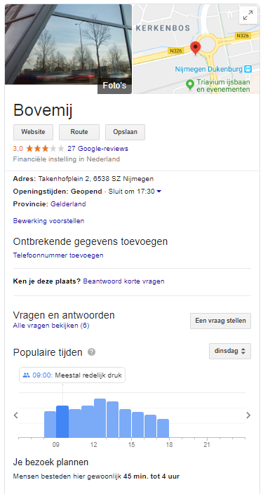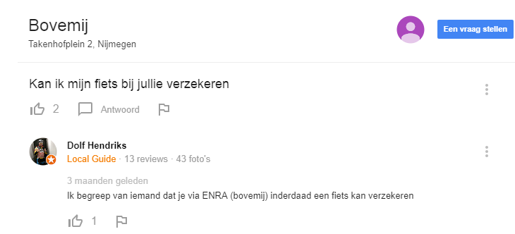Mijn Bedrijf heeft ook een ‘Vraag & Antwoord’-sectie, waarop gebruikers vragen kunnen stellen aan jou en andere gebruikers. Bijvoorbeeld of er bepaalde services worden geboden en of je makkelijk in de buurt kunt parkeren. Je kunt hier antwoord op geven zodat iedere bezoeker met dezelfde vraag gelijk het antwoord kan terugvinden.